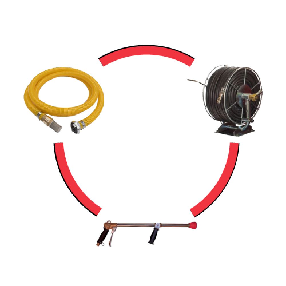 - La devanadera viene montada con conexión a la bomba de agua. Manguera de 70 metros de caucho hasta 80 bar.