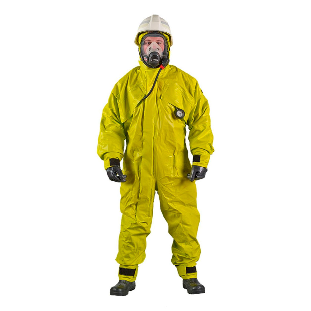- Traje con joroba y capucha, diseñado para usar sobre equipo de protección contra incendios y equipo de respiración ERA • Dos aberturas verticales en el pecho, por donde pasa la manguera de conexión adicional• Cremallera de nylon extra larga, ubicada en la parte delantera, para facilitar la puesta del traje cuando se usa un equipo ERA • Elástico en la cintura para un buen ajuste • Mangas/manguitos abiertas con cierre de gancho y velcro, o sistema de anillos de cierre por bayoneta de guantes para cambiar los guantes de forma rápida y fácil • Perneras abiertas con cierre de gancho y velcro • Rodillas reforzadas para mejorar la resistencia a la abrasión