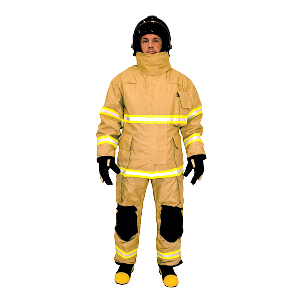 Conjunto de pantalón y chaqueta para extinción de incendios modelo Defender EN – Advance. Diseño tradicional, confeccionado con capa exterior de tejido Thermex EN-R, barrera de humedad de PU transpirable y doble barrera térmica en tejido de aramida con viscosa FR y fieltro de fibra de aramida Variante: Negro, amarillo o naranja, tallas M a EG o a medida (SM).